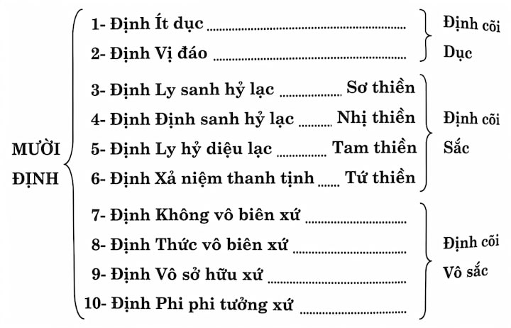 Trong mười định, định Ít dục và định Vị đáo thuộc về cõi trời Dục giới. Định Ly sanh hỷ lạc gọi là Sơ thiền, định Định sanh hỷ lạc gọi là Nhị thiền, định Ly hỷ diệu lạc gọi là Tam thiền, định Xả niệm thanh tịnh gọi là Tứ thiền. Bốn phần này thuộc về cõi trời Sắc giới. Định Không vô biên xứ, định Thức vô biên xứ, định Vô sở hữu xứ, định Phi phi tưởng xứ thuộc về cõi trời Vô sắc. Đó là nói theo danh từ chuyên môn, bây giờ mới giải thích sơ qua.