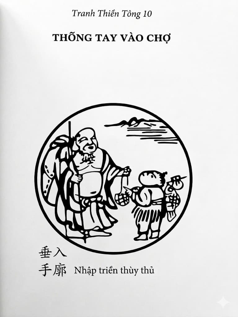 Thõng tay vào chợ là thiền sư đóng cửa am, chống gậy đi xuống chợ, tay cầm bầu rượu tay xách cá chép để hòa với người đời. Giai đoạn này nhà thiền gọi là vào cõi ma. Sau khi vào cõi Phật rồi thiền sư vào cõi ma để giáo hóa chúng sanh, công hạnh mới viên mãn. Nếu vào cõi Phật mà không vào cõi ma thì công hạnh chưa đủ, thiếu phần lợi tha. Vì thế mà các thiền sư thõng tay vào chợ.