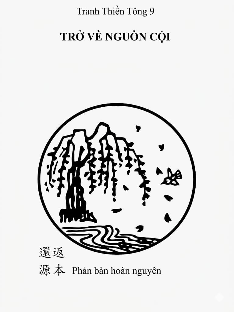 Mục thứ 8 là một vòng tròn trắng không trâu không người chăn. Nếu ngang đây dừng thì rơi vào chìm lặng, không còn gì cả. Cho nên tới mục 9 vẽ một cội cây lá đang rụng xuống gốc, chim đang vỗ cánh bay về tổ. Tu qua trạng thái lặng lẽ thì mới trở về với thể chân thật. Về với Thể chân thật nhà thiền thường gọi là nhập Phật giới, tức là vào cảnh giới của Phật.
