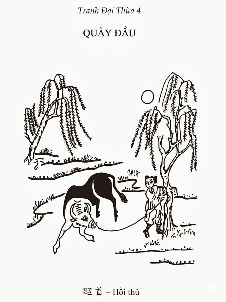 Mục 4 tuy chưa được nửa đường đã thấy hơi khỏe rồi. Mục 1, 2, 3 còn cực khổ nhọc nhằn chăn giữ. Tới mục 4 thì bớt nhọc, tuy nhiên vẫn còn phải cột dây, nghỉ chút chút. Ai tu tới mục này lâu lâu xin về nhà tôi cho, vì trâu đã cột nó không đi ăn lúa mạ, rảnh tay giây lát. Mấy mục trước thì không rảnh chút nào hết. Chưa rảnh, cho đi chơi sao được. Khi trâu còn đang ngang ngạnh chạy ngược chạy xuôi, mà người chăn muốn đi chơi không hợp lý chút nào hết. Khi biết rõ mình tu chưa tới đây thì khoan xin đi chơi. Ai tu tới đây thì một năm chỉ được đi một lần, chứ không được đi nhiều. Tu tới những mục sau mới khả dĩ cho đi tự do.