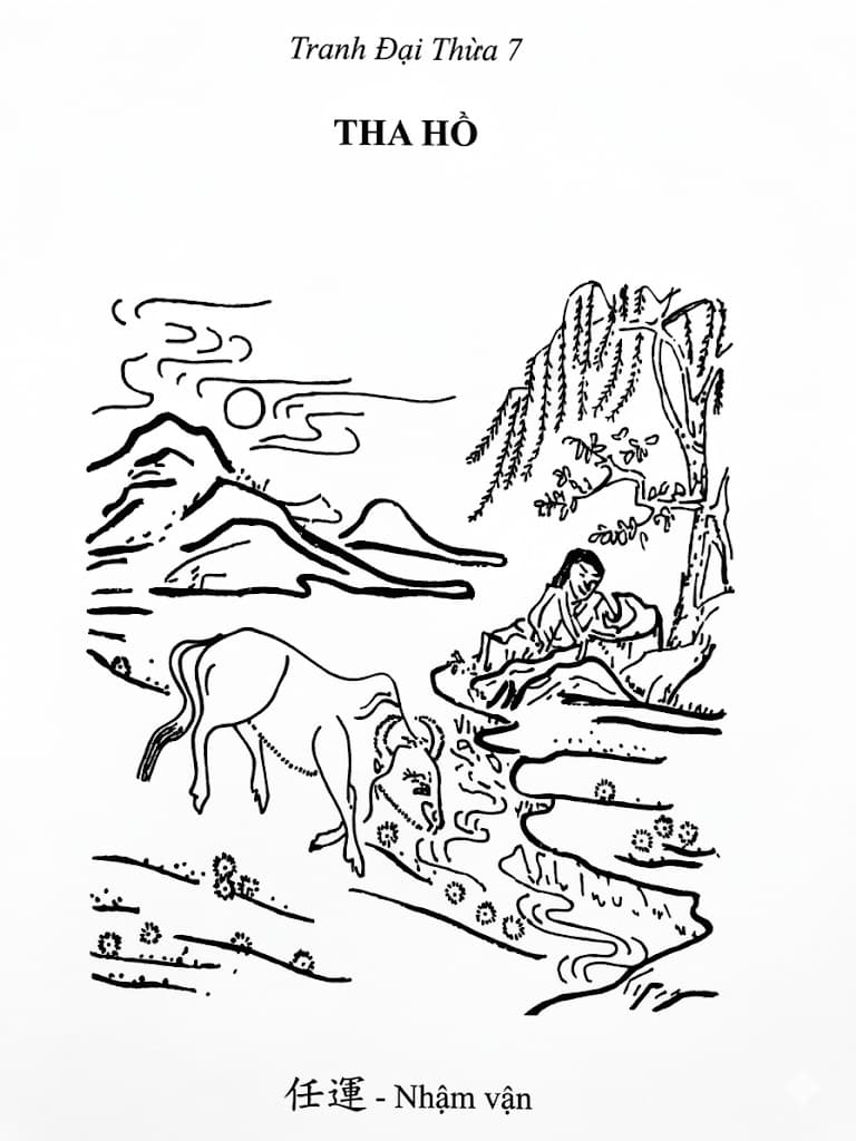 Tu tới giai đoạn tâm lặng lẽ mà hằng sáng soi thì không còn dụng công tu tập nữa, nhìn thấy cảnh vật rất nên thơ đẹp đẽ. Lúc bấy giờ thì tùy thời đói ăn, khát uống, mệt ngủ, không bận lòng với thế sự. Cô Linh Chiếu tu đến chỗ này, nên khi cha cô là Bàng Uẩn nói: “Nan nan nan, thập tạ du ma thọ thượng than”, nghĩa là “Khó khó khó, cây cao vuốt mười tạ dầu mè”, quá trơn nắm tới cây là tuột, leo không được, tu khó như vậy đó. Bà Bàng Uẩn nói: “Dị dị dị, bách thảo thượng đầu Tổ Sư ý”, tức là “Dễ dễ dễ, ý Tổ sư tràn ngập trên đầu trăm cỏ”, tu chẳng có gì khó cả. Đồng tu mà ông thì thấy khó bà thì thấy dễ, cô Linh Chiếu trung dung nói: “Dã bất dị, dã bất nan, cơ lai khiết phạn khốn lai thùy”, nghĩa là “Cũng chẳng dễ, cũng chẳng khó, đói đến thì ăn mệt ngủ khò”, cô tu đến bức tranh thứ bảy, nên cô nói như thế. Nếu chúng ta tu tới mục thứ 1 hay thứ 2 mà cứ đói ăn mệt ngủ thì ăn đòn. Lúc mới tu tâm còn lăng xăng lộn xộn, cần phải gìn giữ kìm chế mà đòi đói ăn, mệt ngủ là buông lung, cần phải răn phạt. Người tu tới nơi, nói đúng chỗ của mình thì hay; còn người học hiểu nhưng không tu, nói không đúng chỗ của mình thì dở. Với người thật tu, tới rồi mới nói. Nếu chưa tới mà nói là bắt chước nói suông, có lỗi đáng trách.